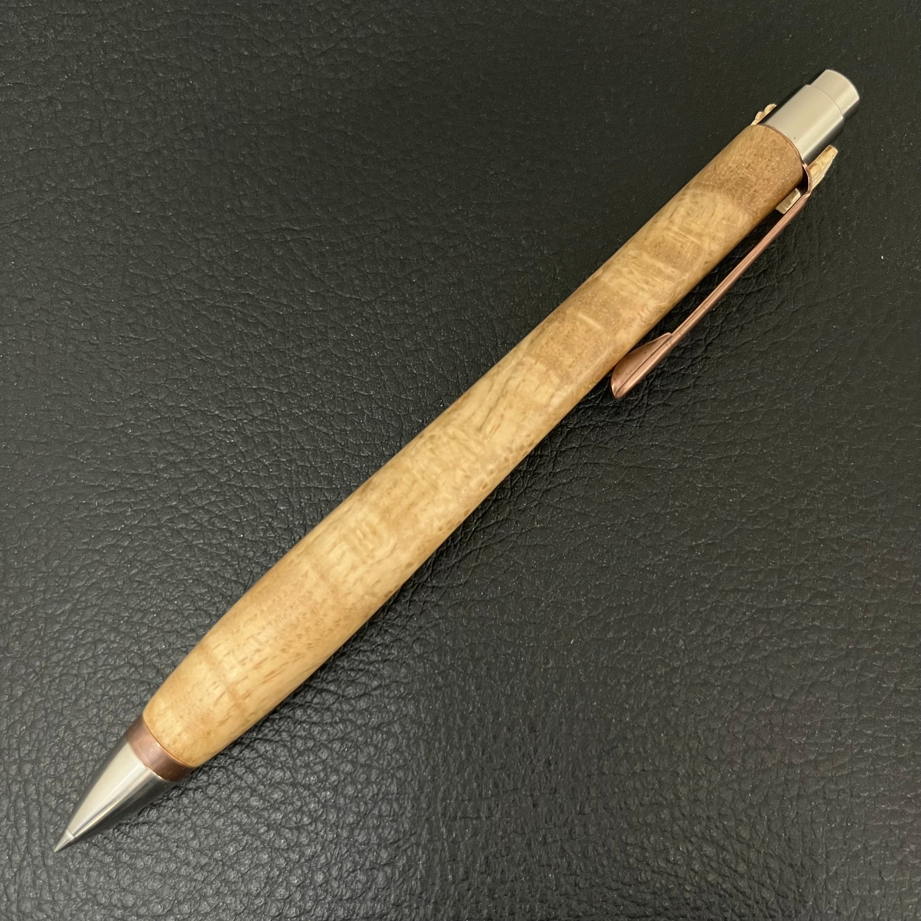 ボールペンのノックシステムは、ドイツ最高のクリックメカニズムを採用してあります。このメカニズムはユニークな機構のため、クリックしたときのカチカチ音が静かで、どんな場所でも気兼ねなく使うことができます。滑らかに動くこのプッシュ感覚を一度味わうと他には戻れなくなってしまうほどの魅力があります。 100分の1単位の加工精度で削り出されたペン先は、軸ブレも全くありません。