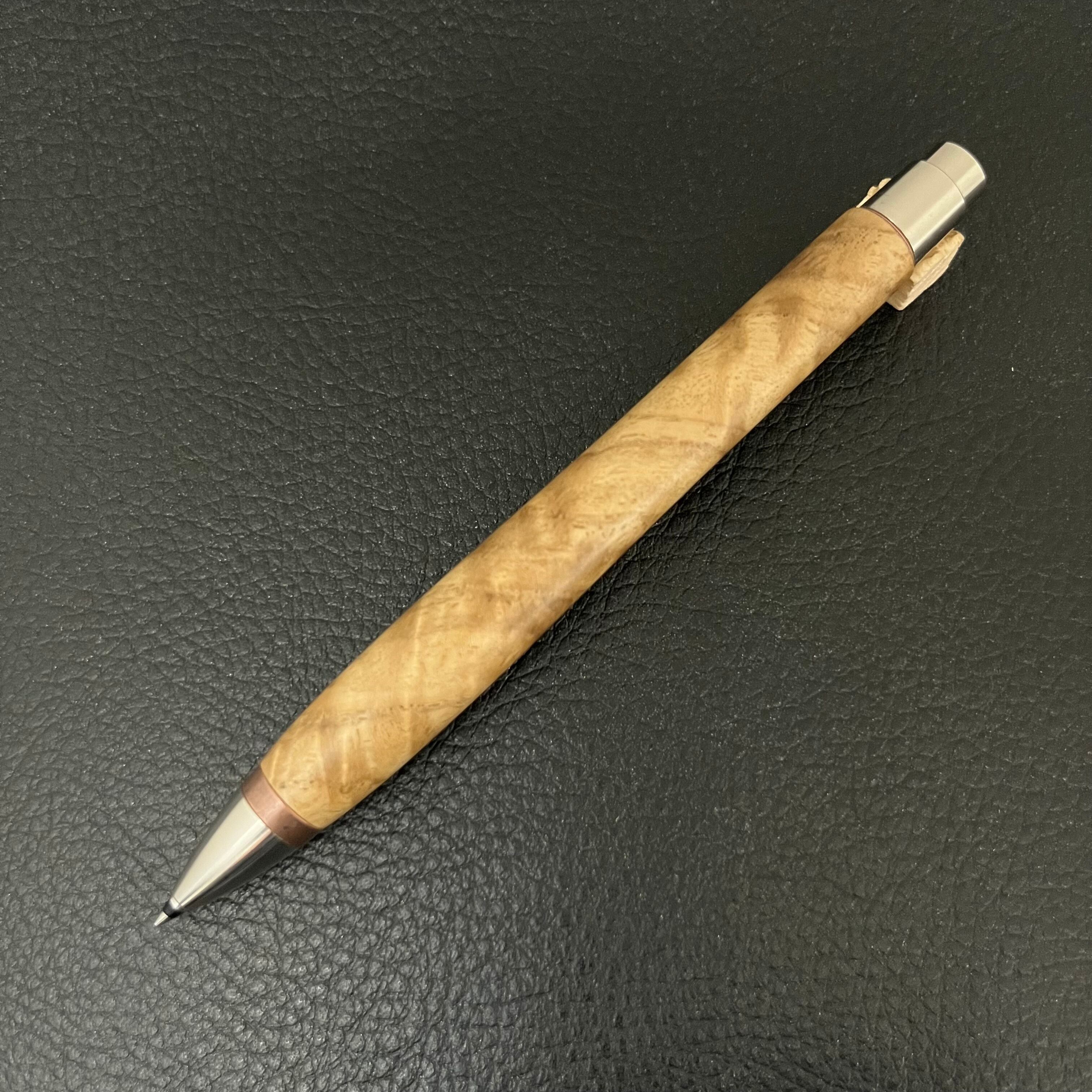 ボールペンのノックシステムは、ドイツ最高のクリックメカニズムを採用してあります。このメカニズムはユニークな機構のため、クリックしたときのカチカチ音が静かで、どんな場所でも気兼ねなく使うことができます。滑らかに動くこのプッシュ感覚を一度味わうと他には戻れなくなってしまうほどの魅力があります。 高級ステンレス材を100分の1単位の加工精度で削り出された口金により芯ブレも全くありません。内部のアルミを使ったリフィルアダプターもオリジナルです。