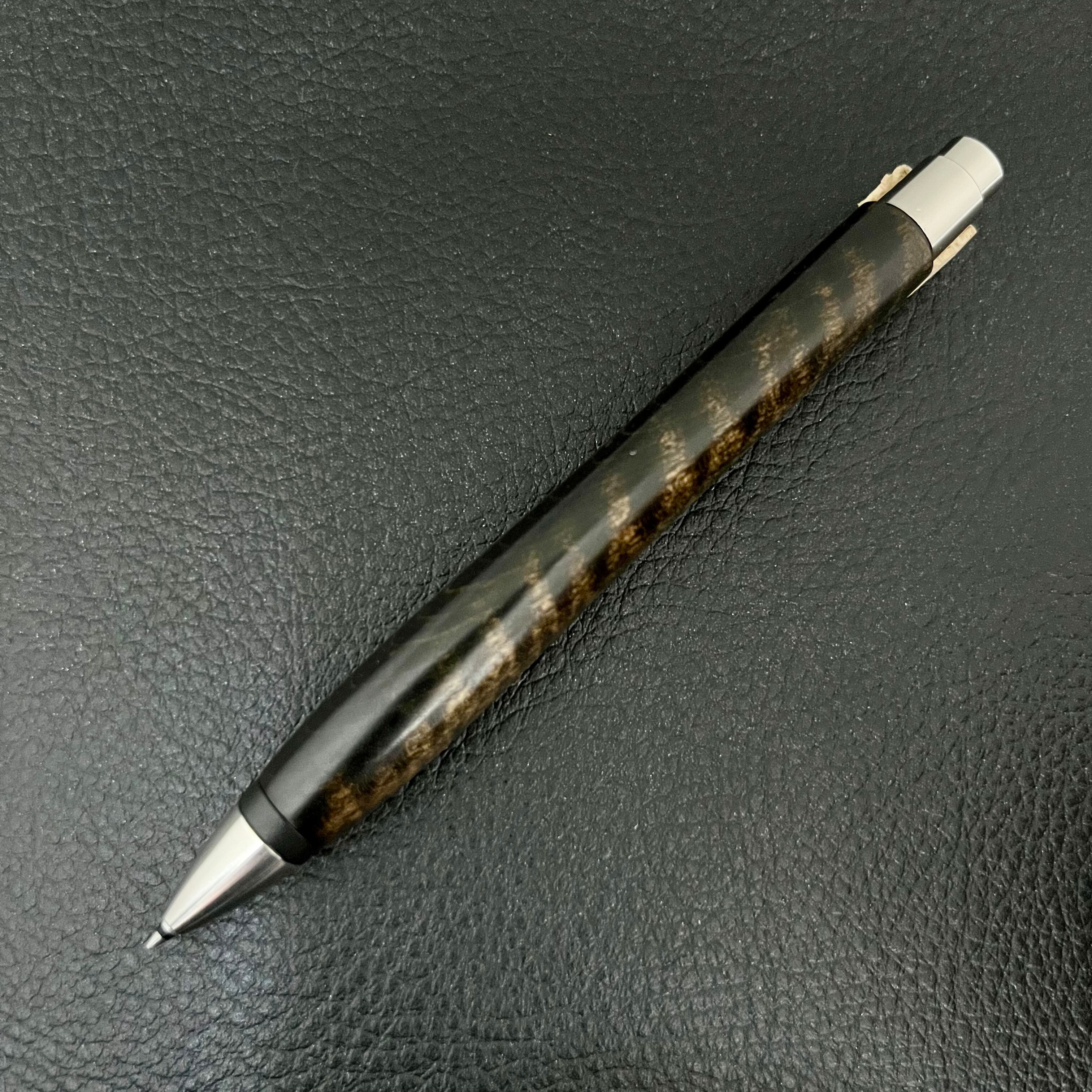 ※楓縮杢国産透漆 大阪の漆塗り職人さんにお願いして、楓縮杢に大変希少な国産黒漆を、何度も塗り重ねて拭き取る(摺り漆)技法で仕上げた黒漆ペンです。