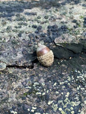 丸や楕円型で、帽子がシマシマ模様の2年成どんぐりがなる樹