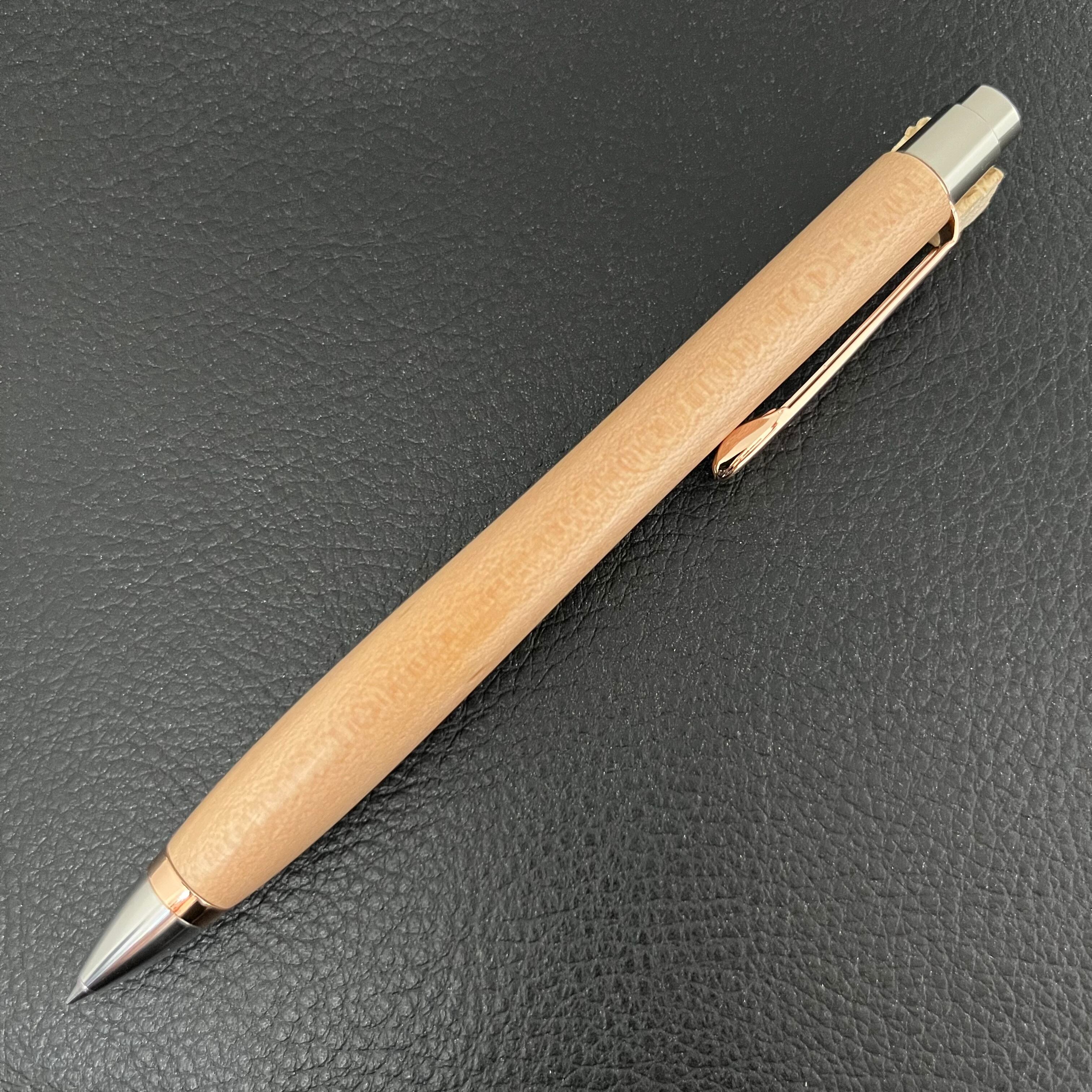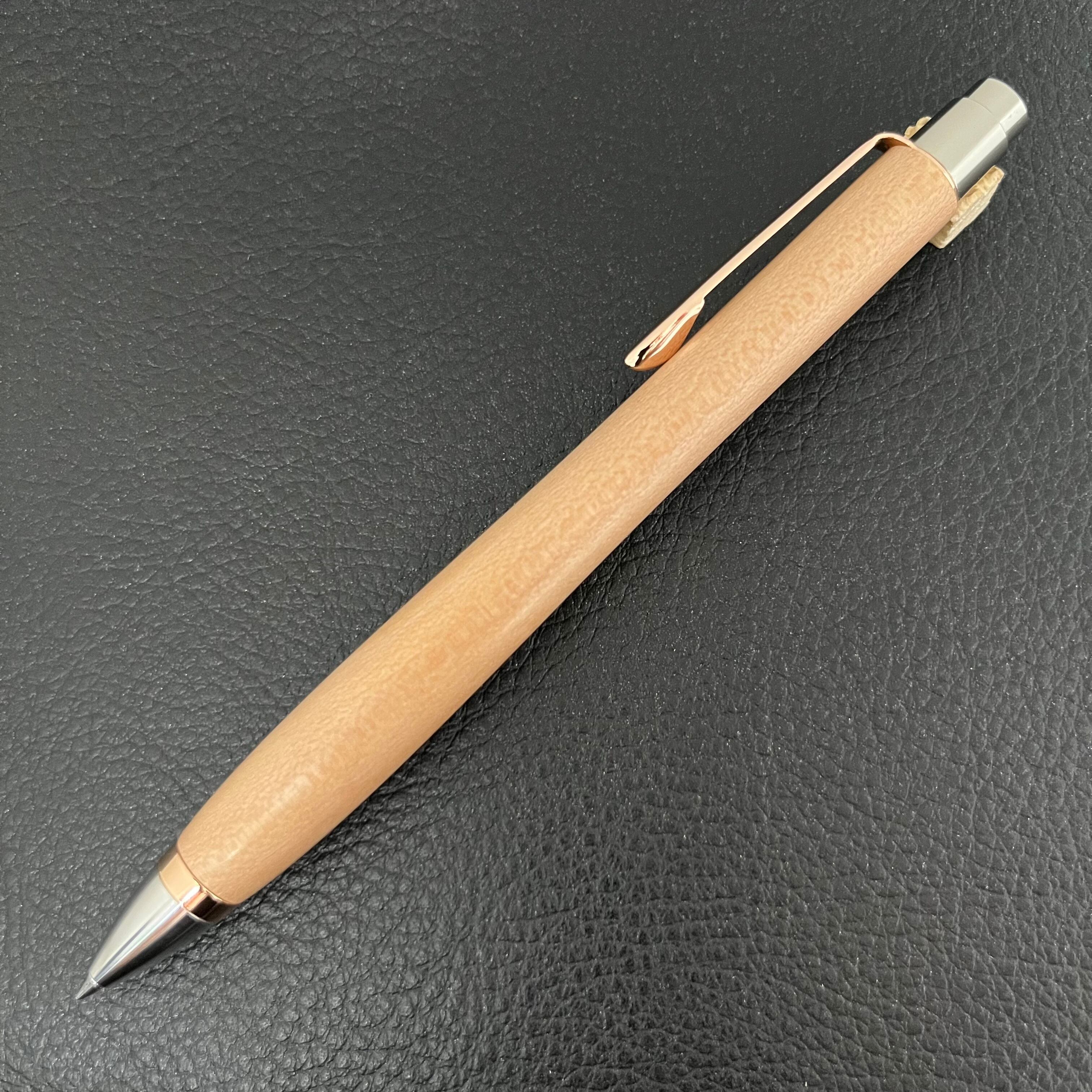 ボールペンのノックシステムは、ドイツ最高のクリックメカニズムを採用してあります。このメカニズムはユニークな機構のため、クリックしたときのカチカチ音が静かで、どんな場所でも気兼ねなく使うことができます。滑らかに動くこのプッシュ感覚を一度味わうと他には戻れなくなってしまうほどの魅力があります。 100分の1単位の加工精度で削り出されたペン先は、軸ブレも全くありません。