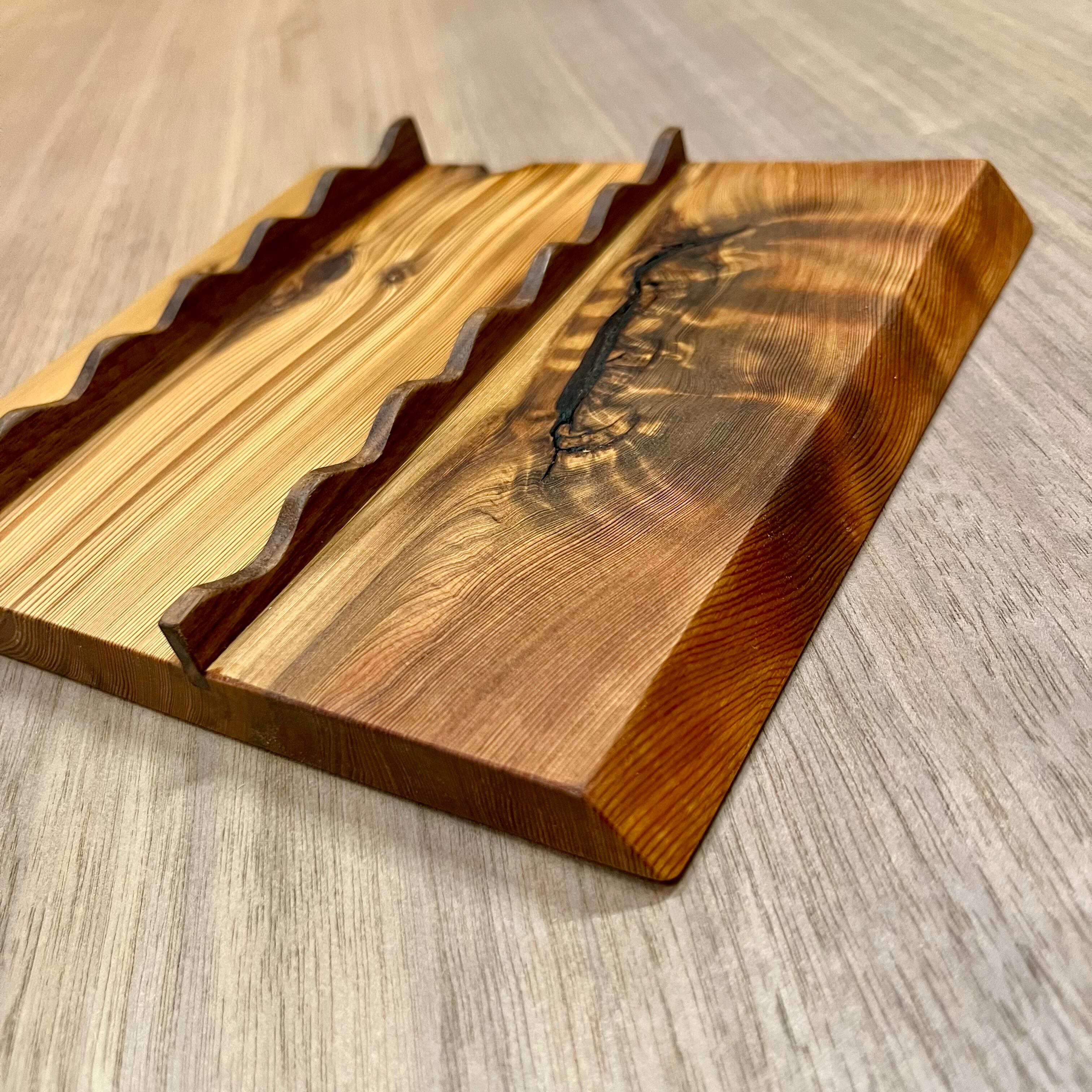 耳付き一枚板を天然オイルで仕上げてあり、ペンの長さや太さが違っても置けるように作られています。