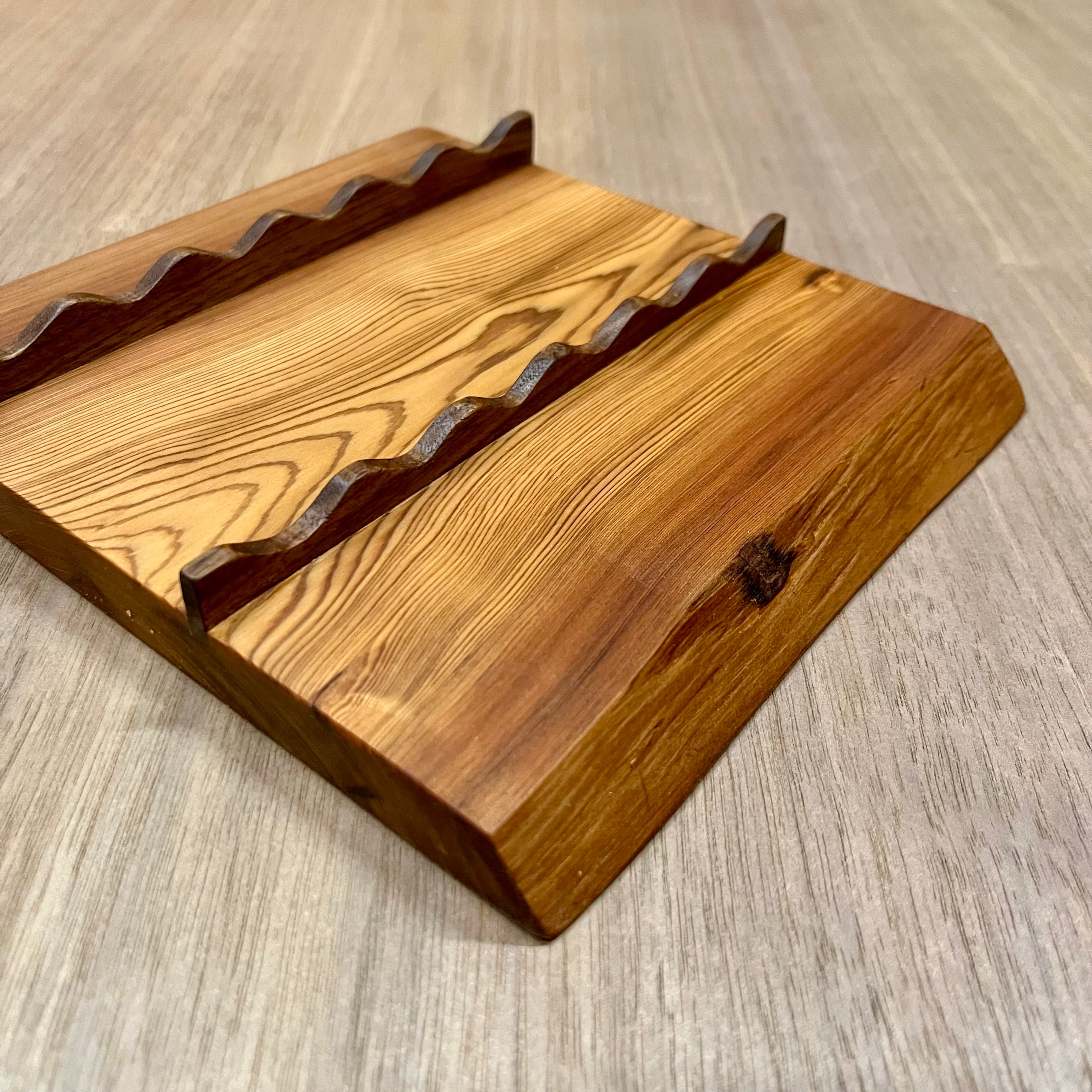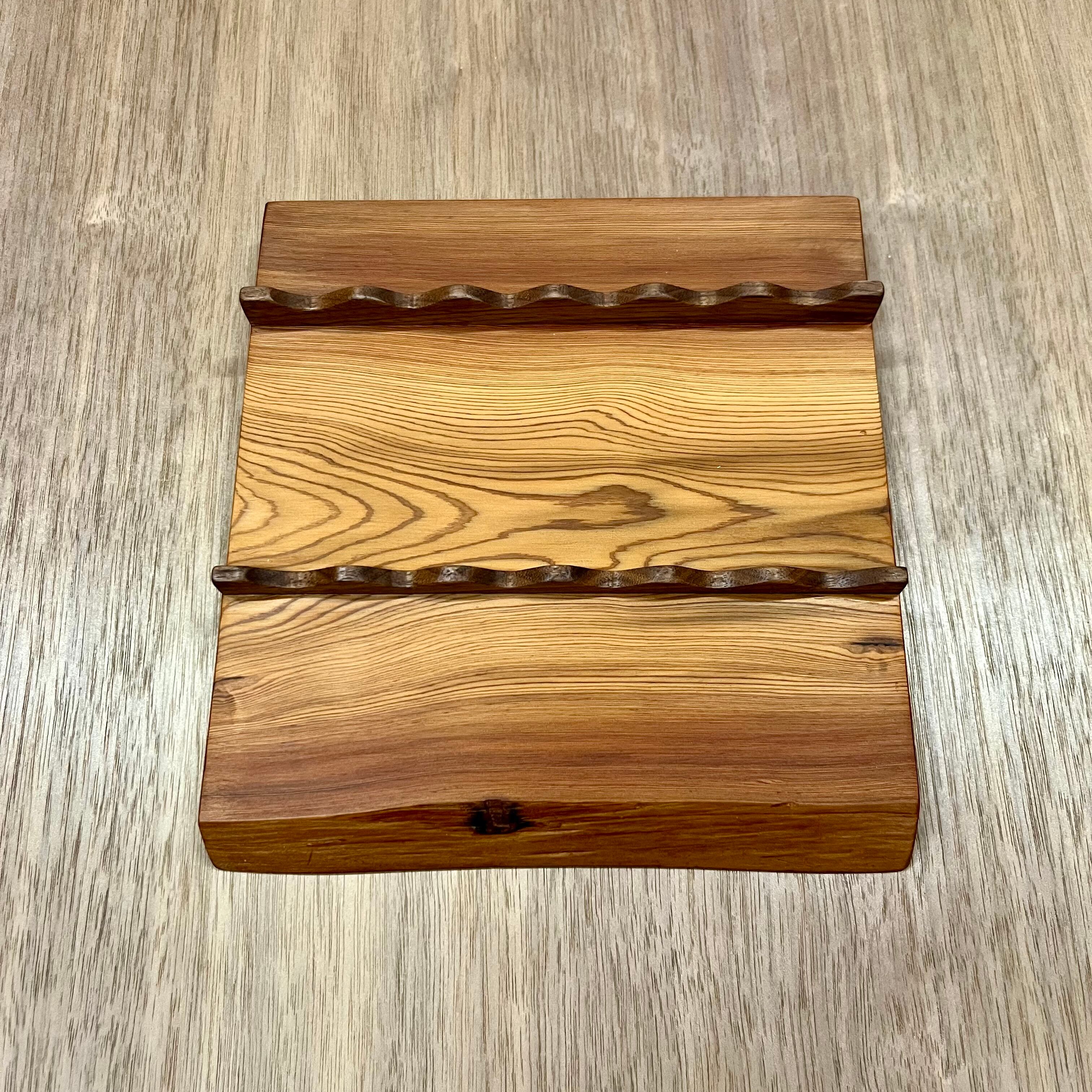 耳付き一枚板を天然オイルで仕上げてあり、ペンの長さや太さが違っても置けるように作られています。