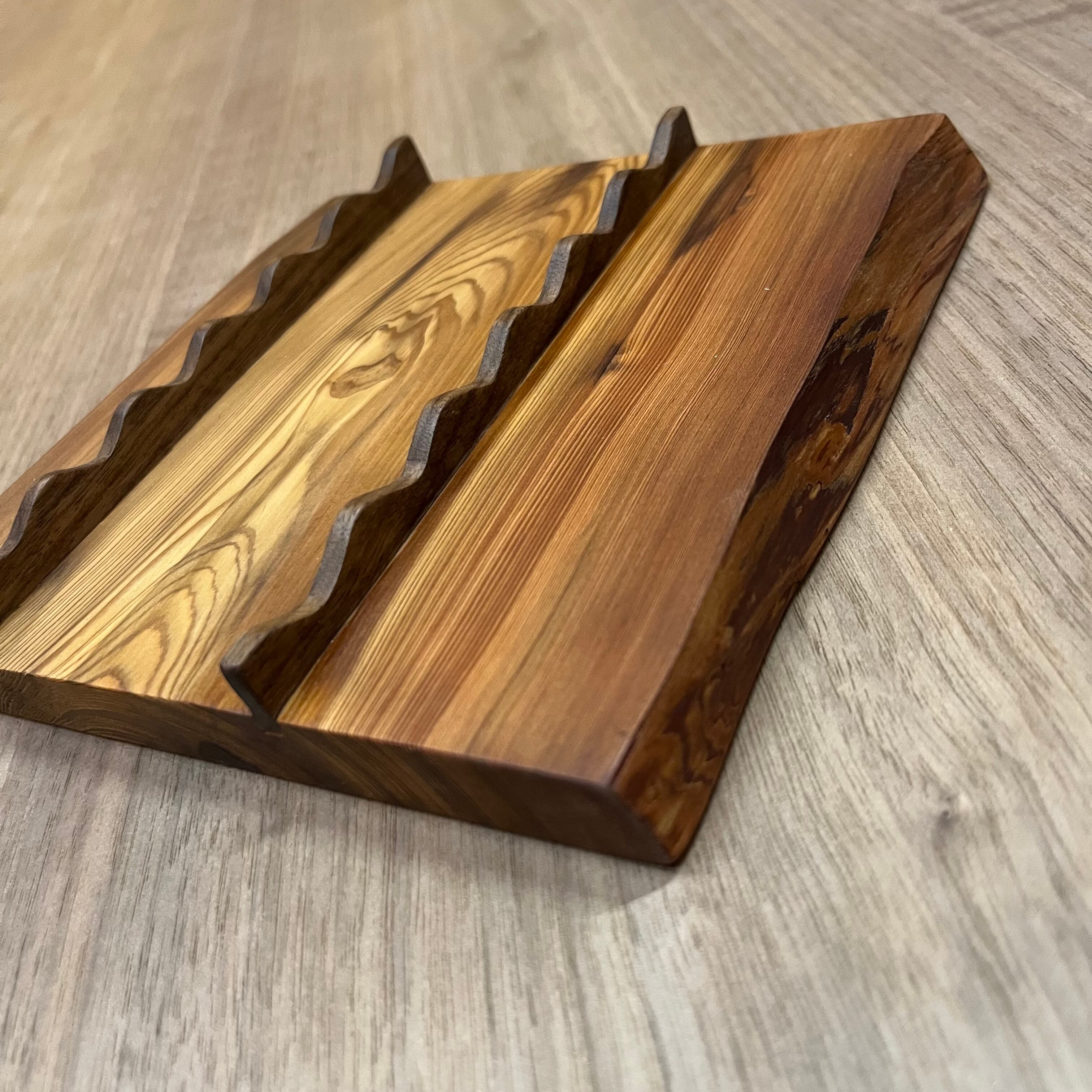 耳付き一枚板を天然オイルで仕上げてあり、ペンの長さや太さが違っても置けるように作られています。