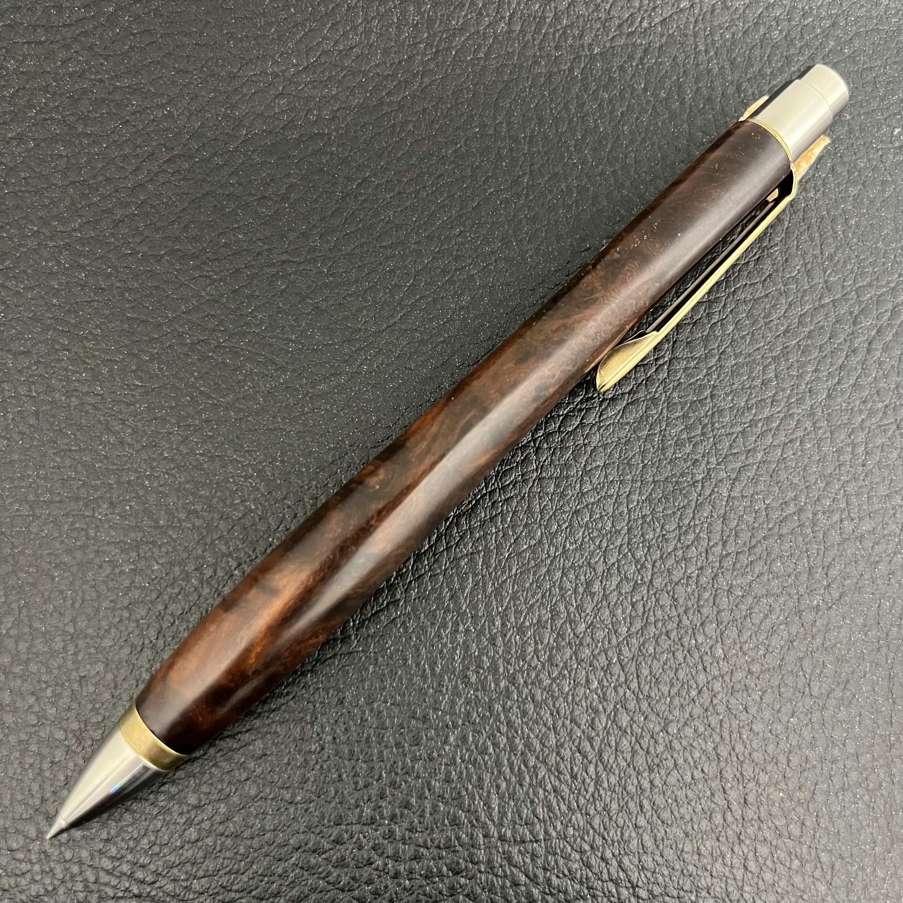 ボールペンのノックシステムは、ドイツ最高のクリックメカニズムを採用してあります。このメカニズムはユニークな機構のため、クリックしたときのカチカチ音が静かで、どんな場所でも気兼ねなく使うことができます。滑らかに動くこのプッシュ感覚を一度味わうと他には戻れなくなってしまうほどの魅力があります。 100分の1単位の加工精度で削り出されたペン先は、軸ブレも全くありません。