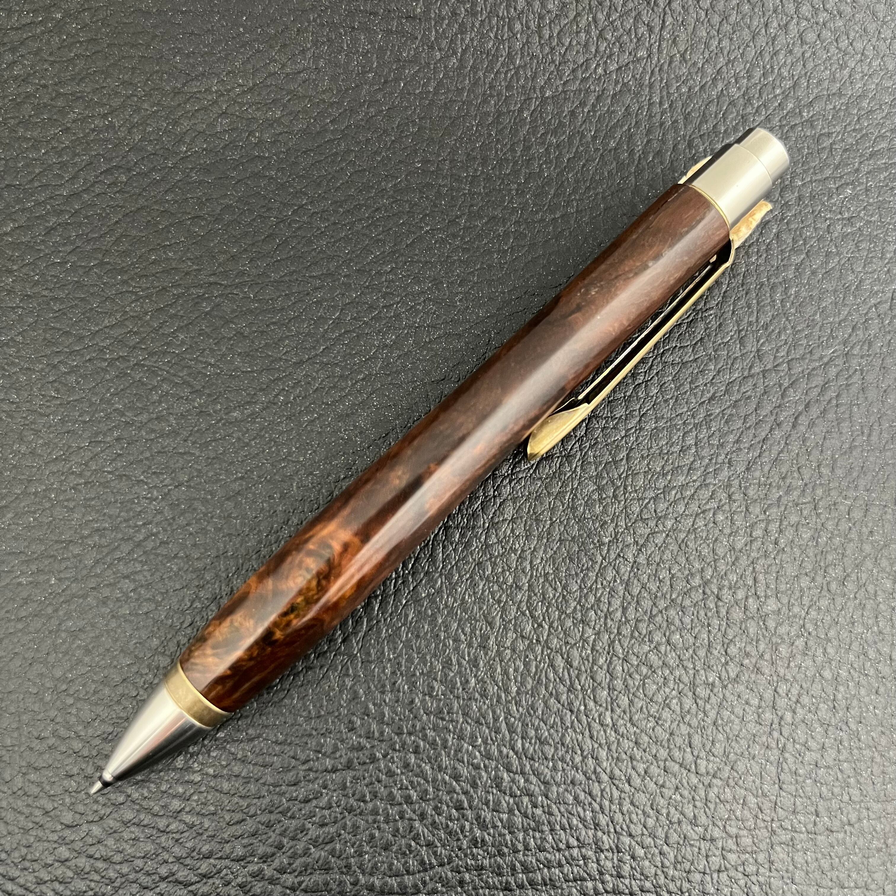 ボールペンのノックシステムは、ドイツ最高のクリックメカニズムを採用してあります。このメカニズムはユニークな機構のため、クリックしたときのカチカチ音が静かで、どんな場所でも気兼ねなく使うことができます。滑らかに動くこのプッシュ感覚を一度味わうと他には戻れなくなってしまうほどの魅力があります。 高級ステンレス材を100分の1単位の加工精度で削り出された口金により芯ブレも全くありません。内部のアルミを使ったリフィルアダプターもオリジナルです。