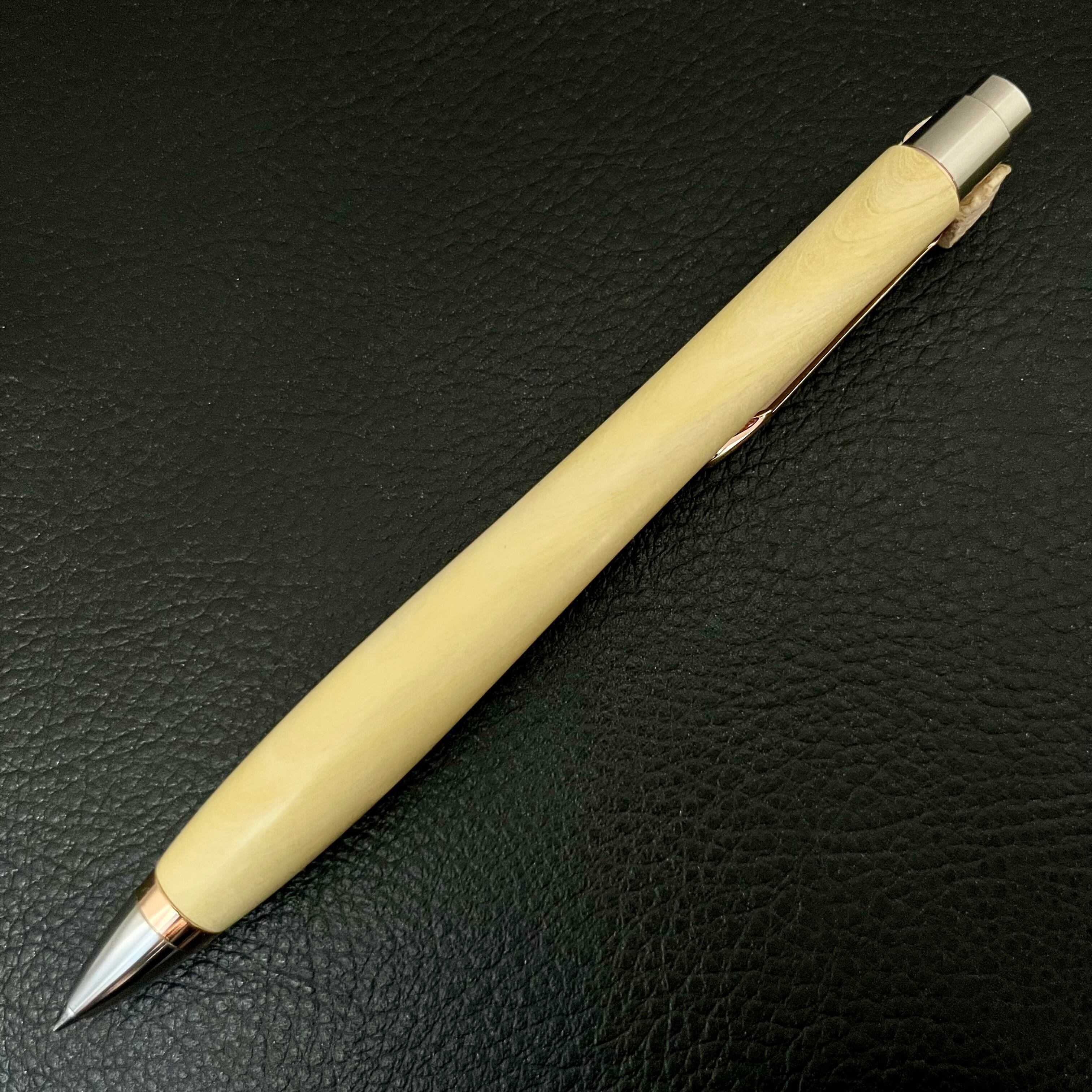ボールペンのノックシステムは、ドイツ最高のクリックメカニズムを採用してあります。このメカニズムはユニークな機構のため、クリックしたときのカチカチ音が静かで、どんな場所でも気兼ねなく使うことができます。滑らかに動くこのプッシュ感覚を一度味わうと他には戻れなくなってしまうほどの魅力があります。 100分の1単位の加工精度で削り出されたペン先は、軸ブレも全くありません。
