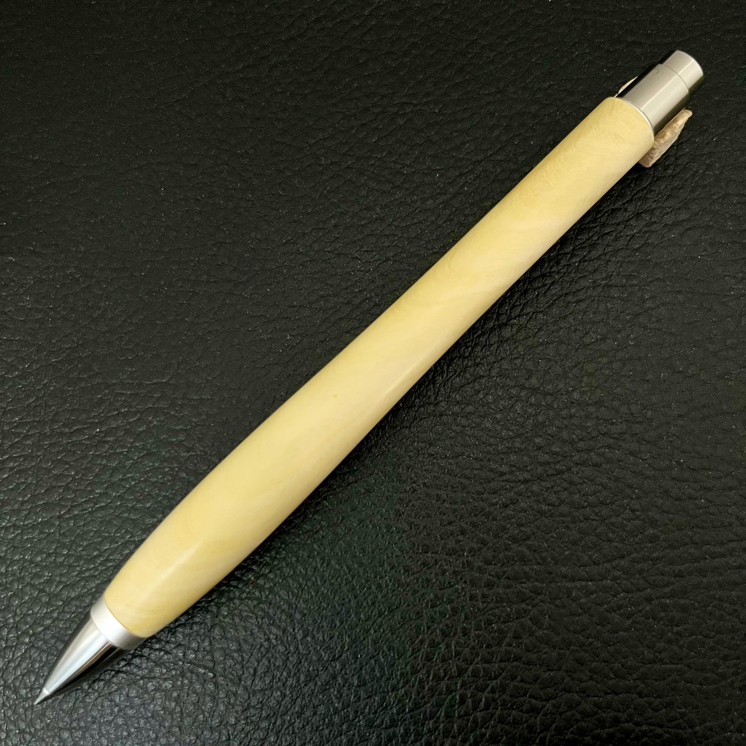 ボールペンのノックシステムは、ドイツ最高のクリックメカニズムを採用してあります。このメカニズムはユニークな機構のため、クリックしたときのカチカチ音が静かで、どんな場所でも気兼ねなく使うことができます。滑らかに動くこのプッシュ感覚を一度味わうと他には戻れなくなってしまうほどの魅力があります。 100分の1単位の加工精度で削り出されたペン先は、軸ブレも全くありません。