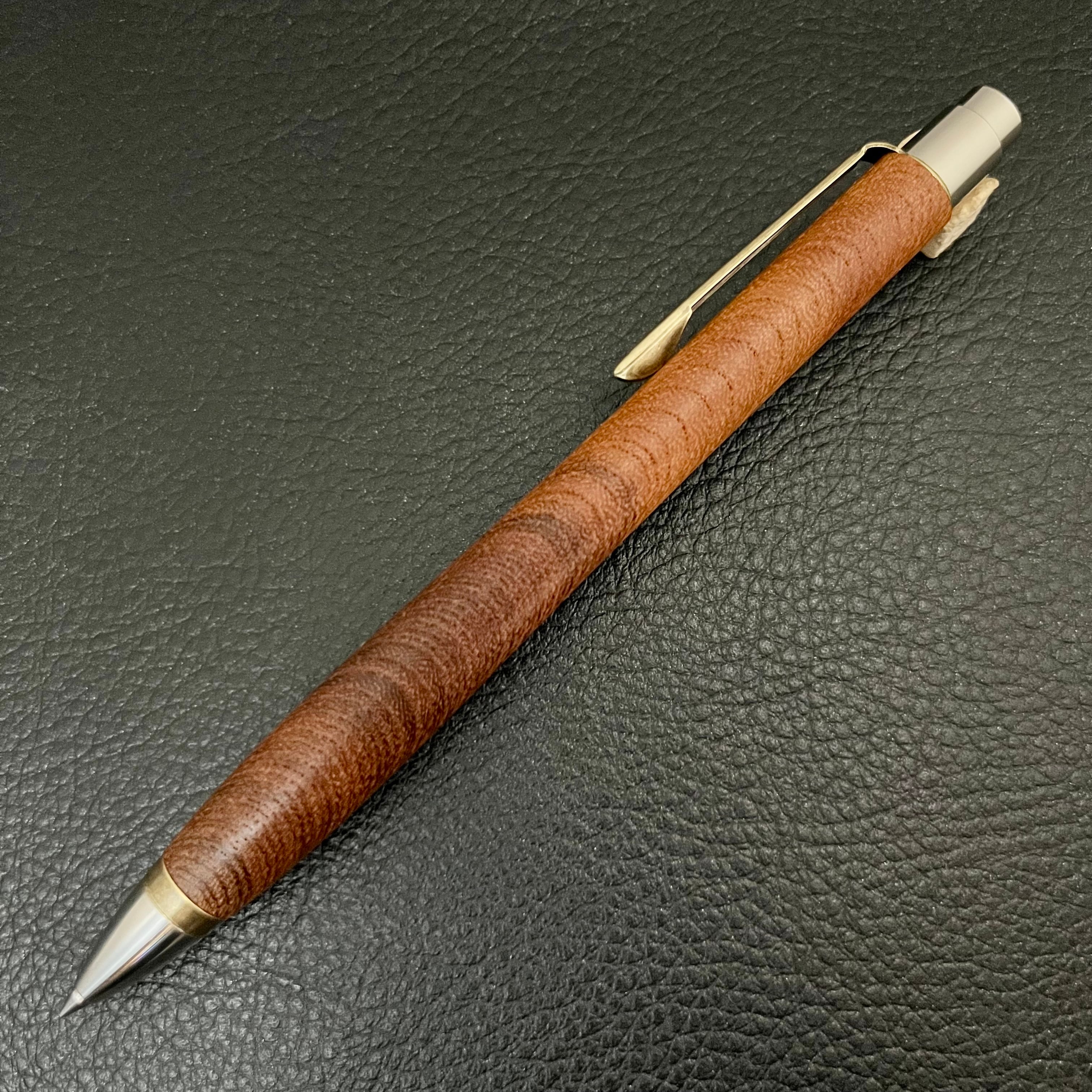 ボールペンのノックシステムは、ドイツ最高のクリックメカニズムを採用してあります。このメカニズムはユニークな機構のため、クリックしたときのカチカチ音が静かで、どんな場所でも気兼ねなく使うことができます。滑らかに動くこのプッシュ感覚を一度味わうと他には戻れなくなってしまうほどの魅力があります。 100分の1単位の加工精度で削り出されたペン先は、軸ブレも全くありません。