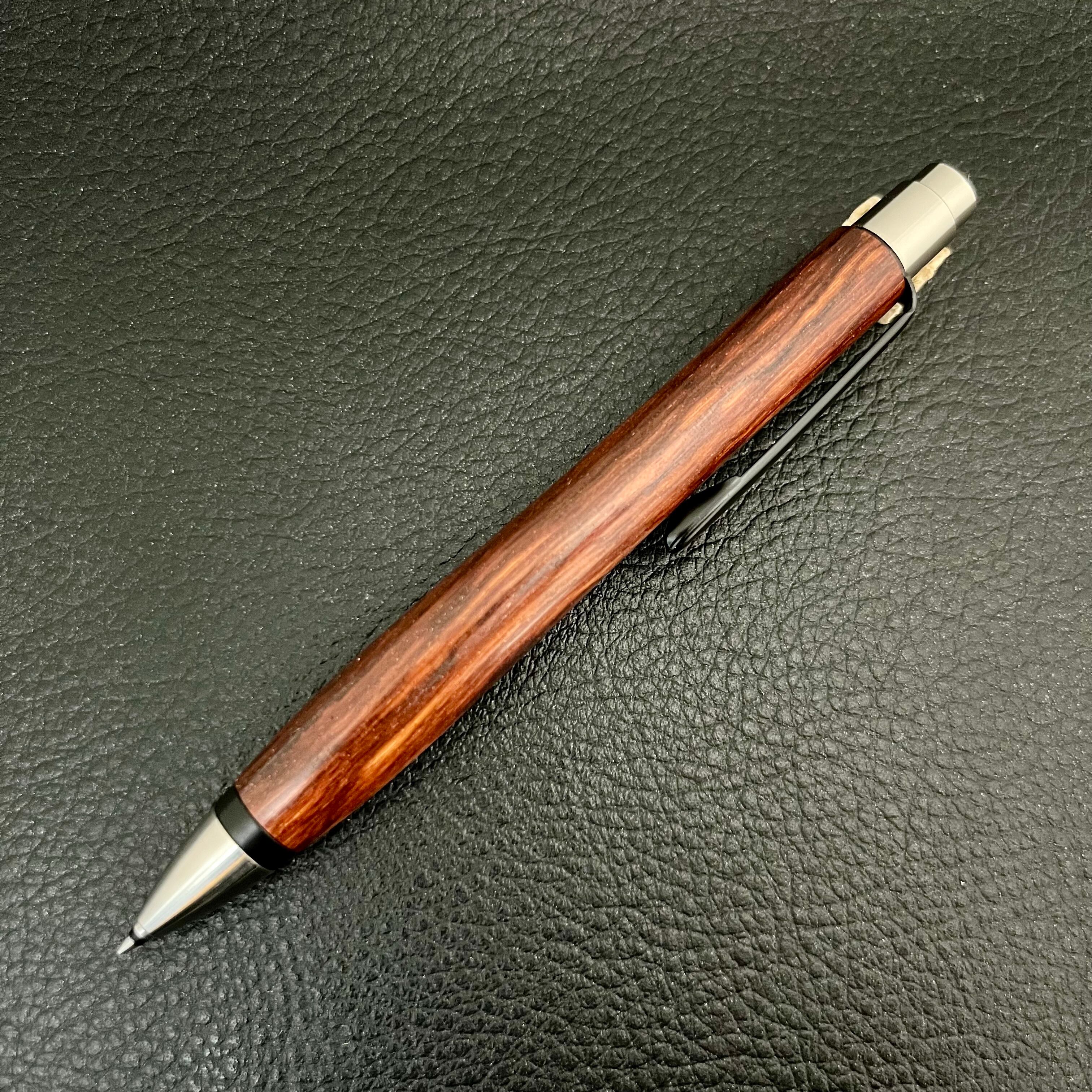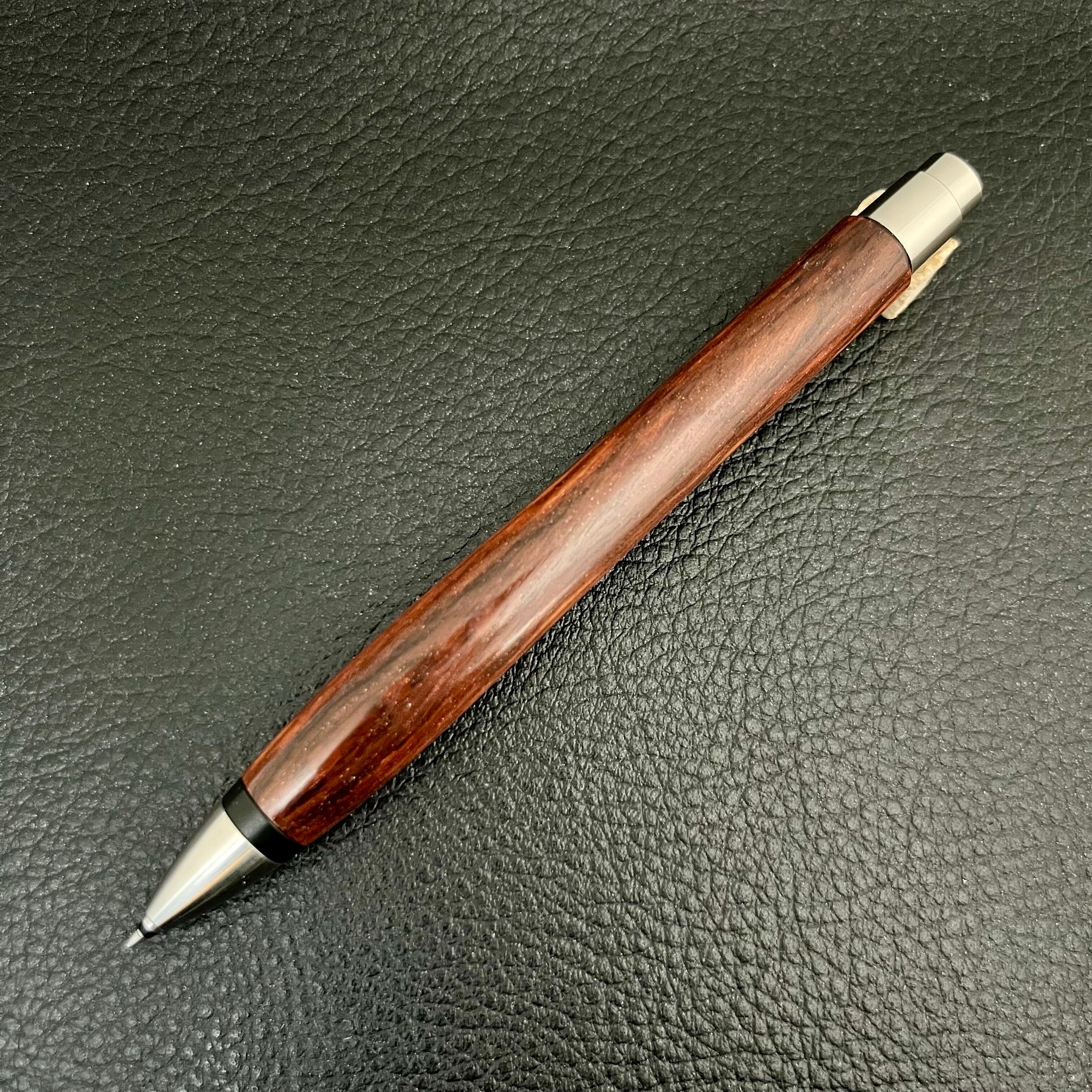 ボールペンのノックシステムは、ドイツ最高のクリックメカニズムを採用してあります。このメカニズムはユニークな機構のため、クリックしたときのカチカチ音が静かで、どんな場所でも気兼ねなく使うことができます。滑らかに動くこのプッシュ感覚を一度味わうと他には戻れなくなってしまうほどの魅力があります。 高級ステンレス材を100分の1単位の加工精度で削り出された口金により芯ブレも全くありません。内部のアルミを使ったリフィルアダプターもオリジナルです。