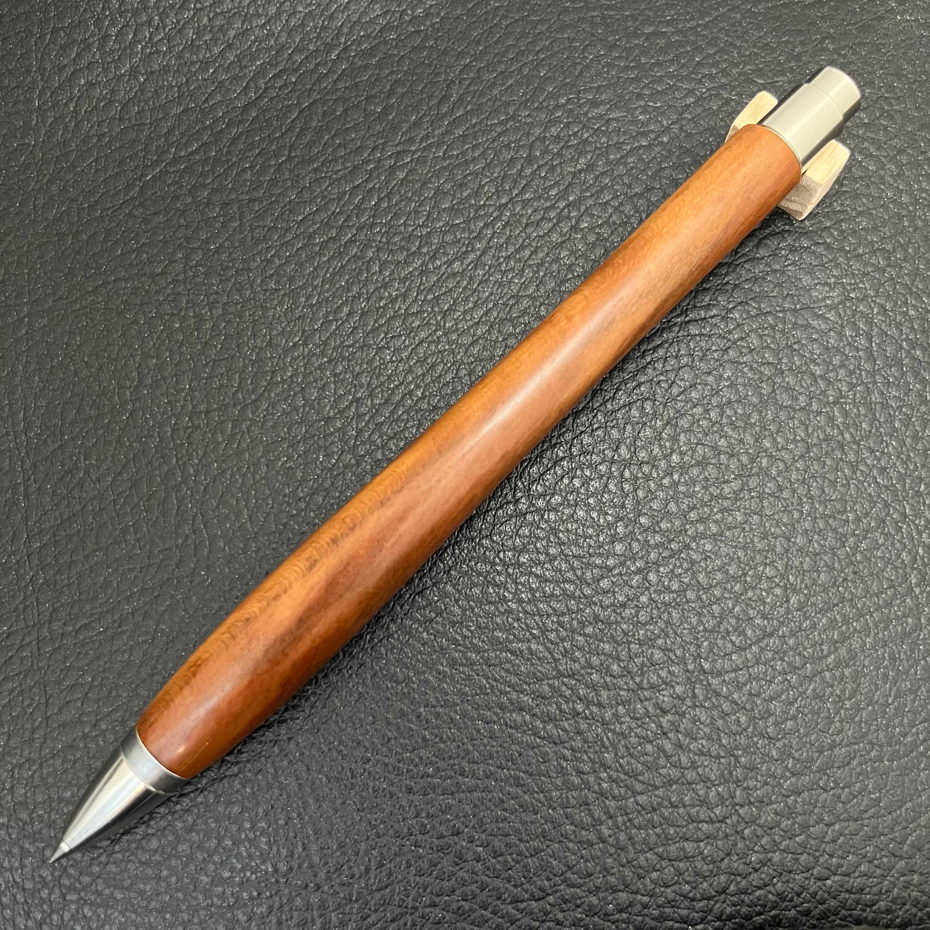 ボールペンのノックシステムは、ドイツ最高のクリックメカニズムを採用してあります。このメカニズムはユニークな機構のため、クリックしたときのカチカチ音が静かで、どんな場所でも気兼ねなく使うことができます。滑らかに動くこのプッシュ感覚を一度味わうと他には戻れなくなってしまうほどの魅力があります。 100分の1単位の加工精度で削り出されたペン先は、軸ブレも全くありません。